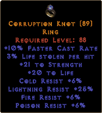 Required Level: 88+10% Faster Cast Rate3% Life stolen per hit+21 to Strength+20 to LifeCold Resist +6%Lightning Resist +25%Fire Resist +6%Poison Resist +6%