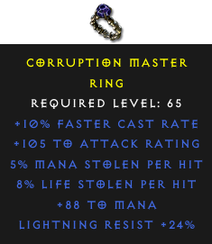Required Level: 65+10% Faster Cast Rate+105 to Attack RatingLightning Resist +24%8% Life stolen per hit5% Mana stolen per hit+88 to Mana