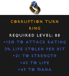 Required Level: 88+21 to Strength+120 to Attack Rating+45 to Life3% Life stolen per hit+49 to Mana