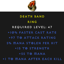 Required Level: 47+10% Faster Cast Rate+15 to Strength+97 to Attack Rating+1 to Mana after each Kill5% Mana stolen per hit+55 to Mana