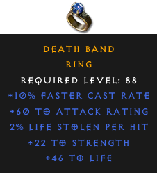 Required Level: 88+10% Faster Cast Rate+22 to Strength+60 to Attack Rating+46 to Life2% Life stolen per hit