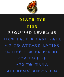 Required Level: 65+10% Faster Cast RateAll Resistances +10+17 to Attack Rating+20 to Life7% Life stolen per hit+72 to Mana
