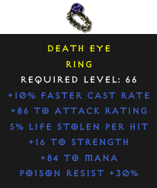 Required Level: 66+10% Faster Cast Rate+16 to Strength+86 to Attack RatingPoison Resist +30%5% Life stolen per hit+84 to Mana
