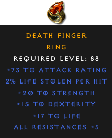 Required Level: 88+20 to Strength+15 to DexterityAll Resistances +5+73 to Attack Rating+17 to Life2% Life stolen per hit