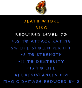 Required Level: 70+5 to Strength+11 to DexterityAll Resistances +10+82 to Attack Rating+13 to Life2% Life stolen per hitMagic Damage Reduced by 2