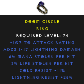 Required Level: 74+107 to Attack RatingCold Resist +11%Lightning Resist +28%Adds Damage3% Life stolen per hit6% Mana stolen per hit