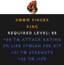 Required Level: 88+21 to Strength+68 to Attack Rating+52 to Life9% Life stolen per hit