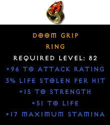 Required Level: 82+15 to Strength+96 to Attack Rating+51 to Life3% Life stolen per hit+17 Maximum Stamina
