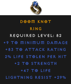 Required Level: 82+2 to Strength+83 to Attack Rating+47 to LifeLightning Resist +29%2% Life stolen per hit+9 to Minimum Damage