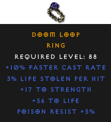 Required Level: 88+10% Faster Cast Rate+17 to Strength+56 to LifePoison Resist +5%3% Life stolen per hit