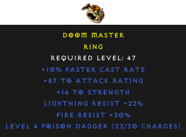 Required Level: 47+10% Faster Cast Rate+14 to Strength+87 to Attack RatingLightning Resist +22%Fire Resist +30%