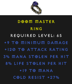 Required Level: 65+120 to Attack RatingCold Resist +27%8% Life stolen per hit3% Mana stolen per hit+9 to Minimum Damage+19 to Mana