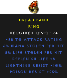 Required Level: 74Replenish Life +8+88 to Attack RatingPoison Resist +25%Lightning Resist +10%8% Life stolen per hit6% Mana stolen per hit