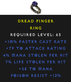 Required Level: 65+10% Faster Cast Rate+79 to Attack RatingPoison Resist +12%7% Life stolen per hit4% Mana stolen per hit+58 to Mana