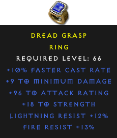 Required Level: 66+10% Faster Cast Rate+18 to Strength+96 to Attack RatingLightning Resist +12%Fire Resist +13%+9 to Minimum Damage