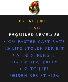 Required Level: 88+10% Faster Cast Rate+19 to Strength+13 to Dexterity+10 to LifePoison Resist +13%1% Life stolen per hit