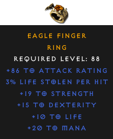 Required Level: 88+19 to Strength+15 to Dexterity+86 to Attack Rating+10 to Life3% Life stolen per hit+20 to Mana