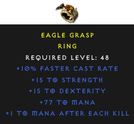 Required Level: 48+10% Faster Cast Rate+15 to Strength+15 to Dexterity+1 to Mana after each Kill+77 to Mana