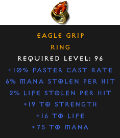 Required Level: 96+10% Faster Cast Rate+19 to Strength+16 to Life2% Life stolen per hit6% Mana stolen per hit+75 to Mana
