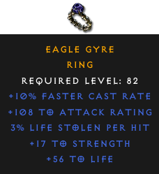 Required Level: 82+10% Faster Cast Rate+17 to Strength+108 to Attack Rating+56 to Life3% Life stolen per hit