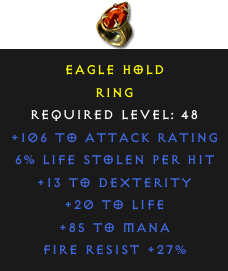 Required Level: 48+13 to Dexterity+106 to Attack Rating+20 to LifeFire Resist +27%6% Life stolen per hit+85 to Mana