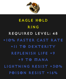 Required Level: 48+10% Faster Cast Rate+11 to DexterityReplenish Life +9Poison Resist +16%Lightning Resist +30%+9 to Mana