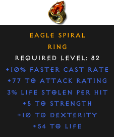 Required Level: 82+10% Faster Cast Rate+5 to Strength+10 to Dexterity+77 to Attack Rating+54 to Life3% Life stolen per hit
