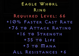 Required Level: 66+10% Faster Cast Rate+76 to Attack Rating+16 to Strength+35 to Life+3 to ManaAll Resistances +6