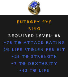 Required Level: 88+24 to Strength+7 to Dexterity+78 to Attack Rating+43 to Life2% Life stolen per hit