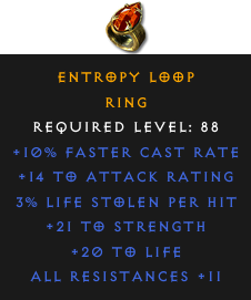 Required Level: 88+10% Faster Cast Rate+21 to StrengthAll Resistances +11+14 to Attack Rating+20 to Life3% Life stolen per hit