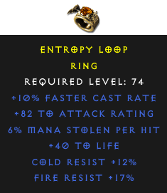 Required Level: 74+10% Faster Cast Rate+82 to Attack Rating+40 to LifeCold Resist +12%Fire Resist +17%6% Mana stolen per hit