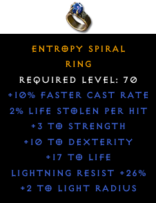 Required Level: 70+10% Faster Cast Rate+3 to Strength+10 to Dexterity+17 to LifeLightning Resist +26%+2 to Light Radius2% Life stolen per hit