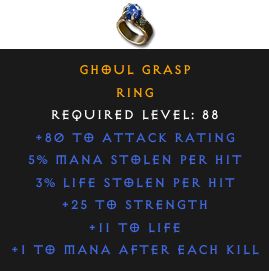 Required Level: 88+25 to Strength+80 to Attack Rating+11 to Life+1 to Mana after each Kill3% Life stolen per hit5% Mana stolen per hit