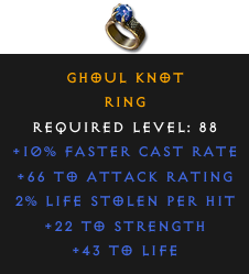 Required Level: 88+10% Faster Cast Rate+22 to Strength+66 to Attack Rating+43 to Life2% Life stolen per hit