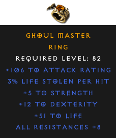 Required Level: 82+5 to Strength+12 to DexterityAll Resistances +8+106 to Attack Rating+51 to Life3% Life stolen per hit