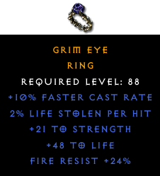 Required Level: 88+10% Faster Cast Rate+21 to Strength+48 to LifeFire Resist +24%2% Life stolen per hit