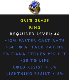 Required Level: 46+10% Faster Cast Rate+54 to Attack Rating+28 to LifeCold Resist +18%Lightning Resist +16%5% Mana stolen per hit