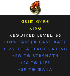 Required Level: 66+10% Faster Cast Rate+20 to Strength+102 to Attack Rating+26 to Life+59 to Mana