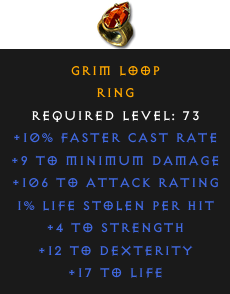 Required Level: 73+10% Faster Cast Rate+4 to Strength+12 to Dexterity+106 to Attack Rating+17 to Life1% Life stolen per hit+9 to Minimum Damage
