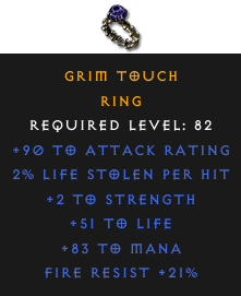 Required Level: 82+2 to Strength+90 to Attack Rating+51 to LifeFire Resist +21%2% Life stolen per hit+83 to Mana