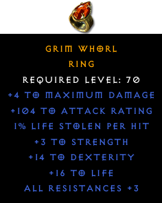 Required Level: 70+3 to Strength+14 to DexterityAll Resistances +3+4 to Maximum Damage+104 to Attack Rating+16 to Life1% Life stolen per hit