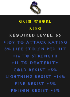 Required Level: 66+16 to Strength+11 to Dexterity+109 to Attack RatingPoison Resist +5%Cold Resist +5%Lightning Resist +14%Fire Resist +5%8% Life stolen per hit