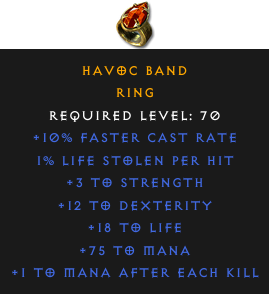 Required Level: 70+10% Faster Cast Rate+3 to Strength+12 to Dexterity+18 to Life+1 to Mana after each Kill1% Life stolen per hit+75 to Mana