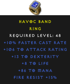 Required Level: 48+10% Faster Cast Rate+13 to Dexterity+106 to Attack Rating+8 to LifeFire Resist +15%+86 to Mana