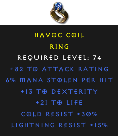 Required Level: 74+13 to Dexterity+82 to Attack Rating+21 to LifeCold Resist +30%Lightning Resist +15%6% Mana stolen per hit