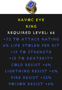 Required Level: 66+19 to Strength+12 to Dexterity+72 to Attack RatingPoison Resist +6%Cold Resist +6%Lightning Resist +6%Fire Resist +35%6% Life stolen per hit