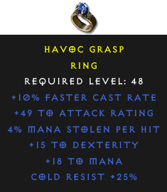 Required Level: 48+10% Faster Cast Rate+15 to Dexterity+49 to Attack RatingCold Resist +25%4% Mana stolen per hit+18 to Mana