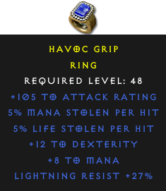 Required Level: 48+12 to Dexterity+105 to Attack RatingLightning Resist +27%5% Life stolen per hit5% Mana stolen per hit+8 to Mana