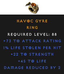Required Level: 88+22 to Strength+73 to Attack Rating+45 to Life1% Life stolen per hitDamage Reduced by 2