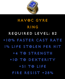 Required Level: 82+10% Faster Cast Rate+4 to Strength+10 to Dexterity+51 to LifeFire Resist +28%1% Life stolen per hit